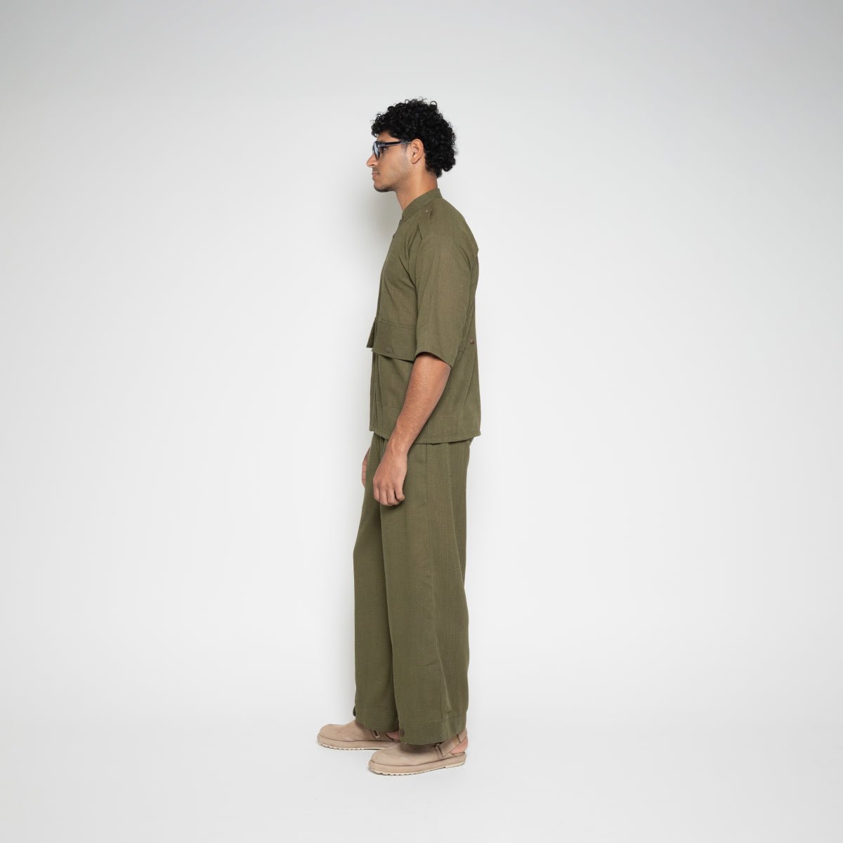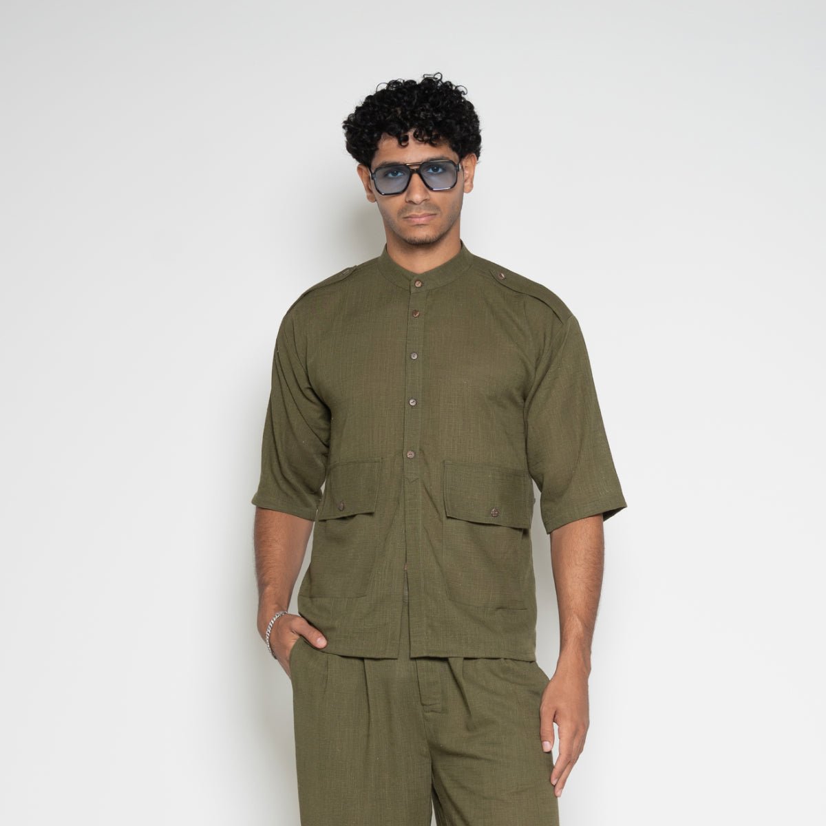 Premium woven mid-weight shirt in linen. Features a Japanese style stand collar, dual front large pockets, button down styling, and flat hem. Epaulette detail at shoulders.
