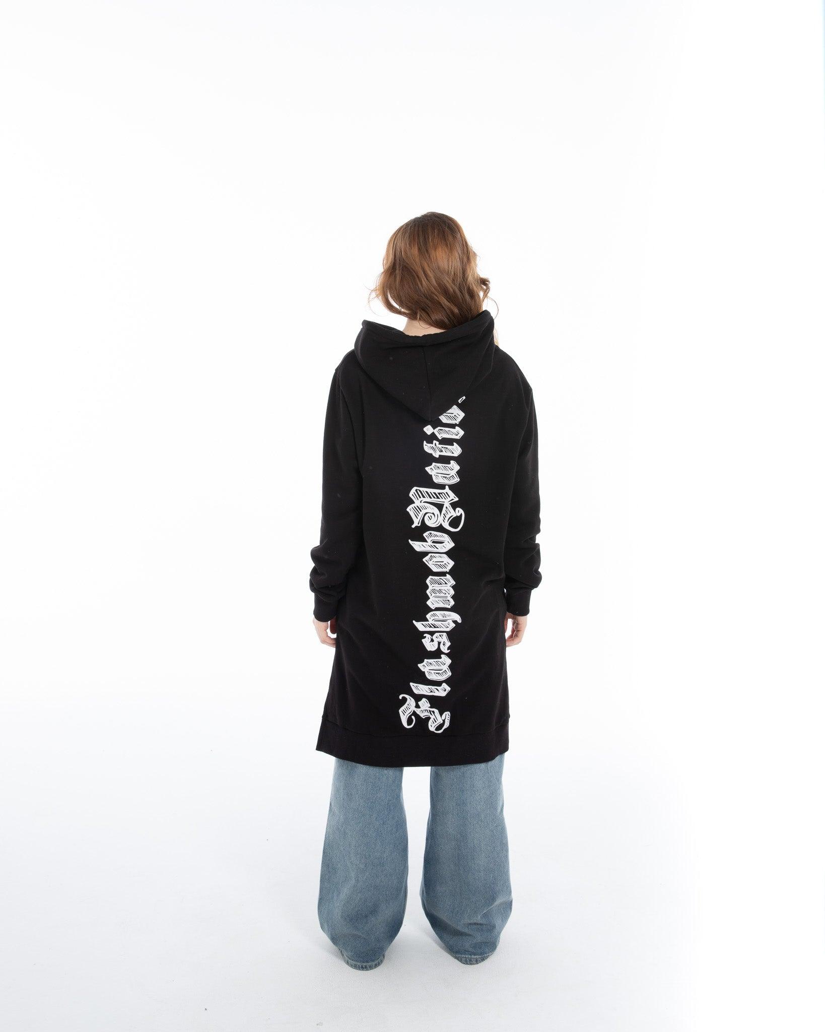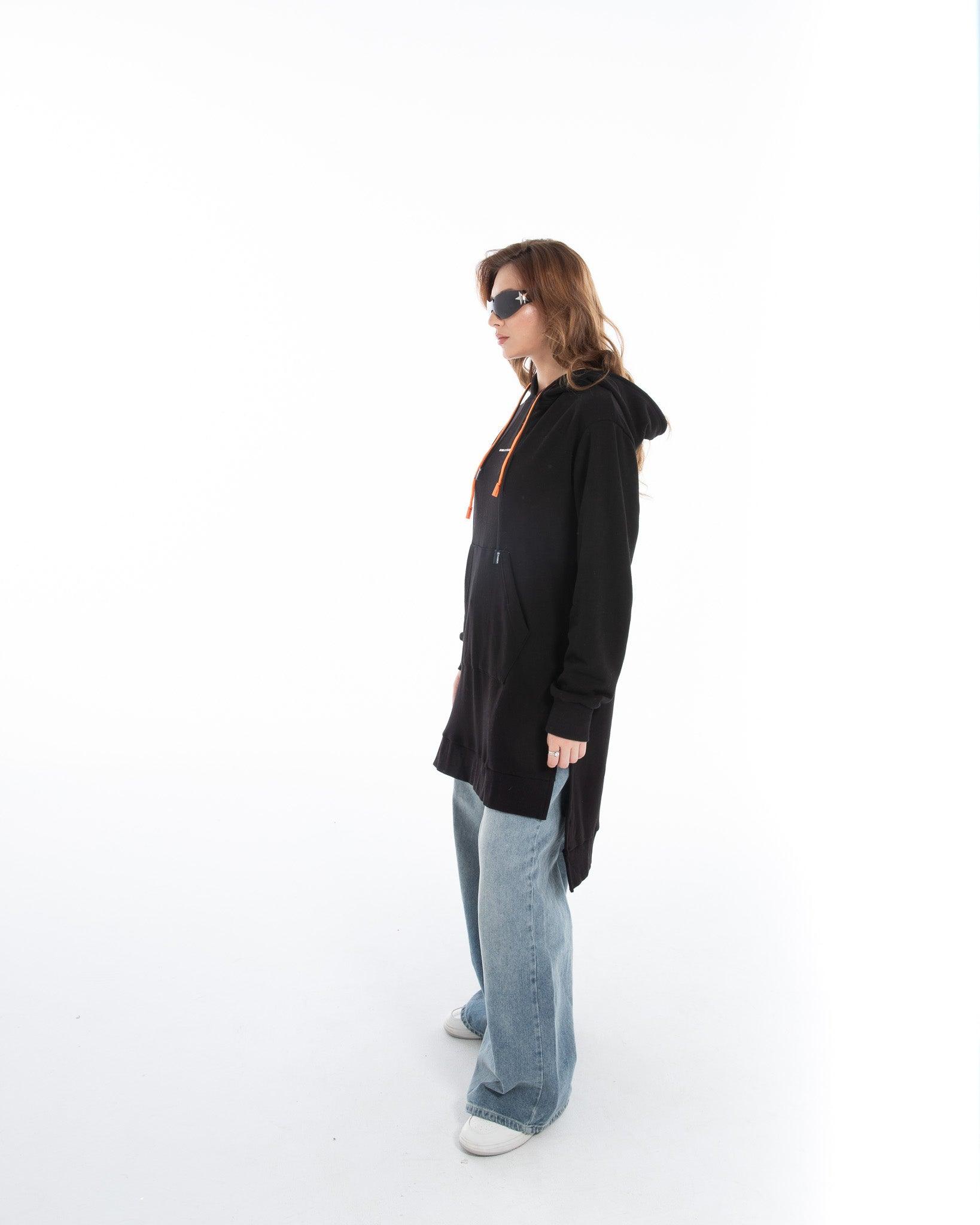 This longline hoodie delivers minimalist streetwear style in classic black. Perfect for casual wear, travel, or bold urban looks.
